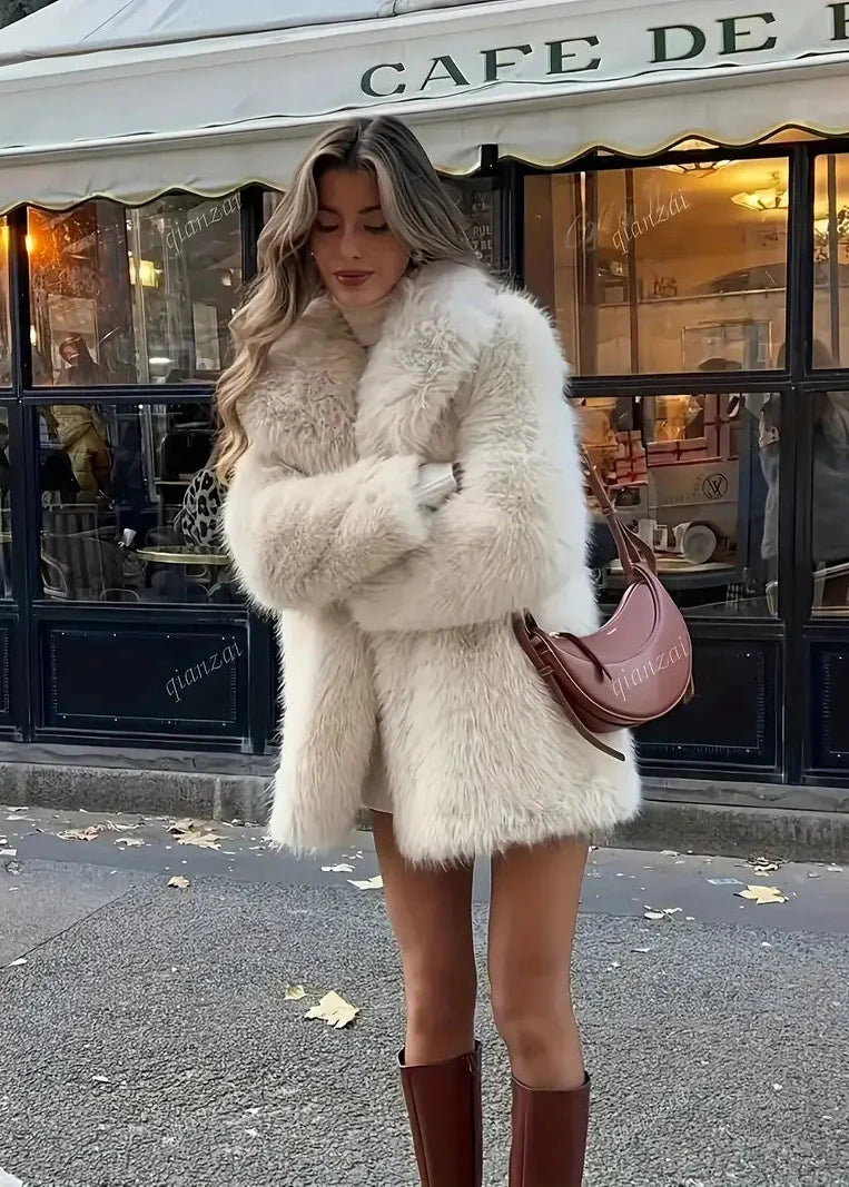 Le Manteau Fourrure Éclat Ivoire séduit par son volume luxueux et sa texture ultra-douce façon peluche. Sa coupe droite, ses manches généreuses et son col à revers créent une allure chic et lumineuse qui capte le regard.